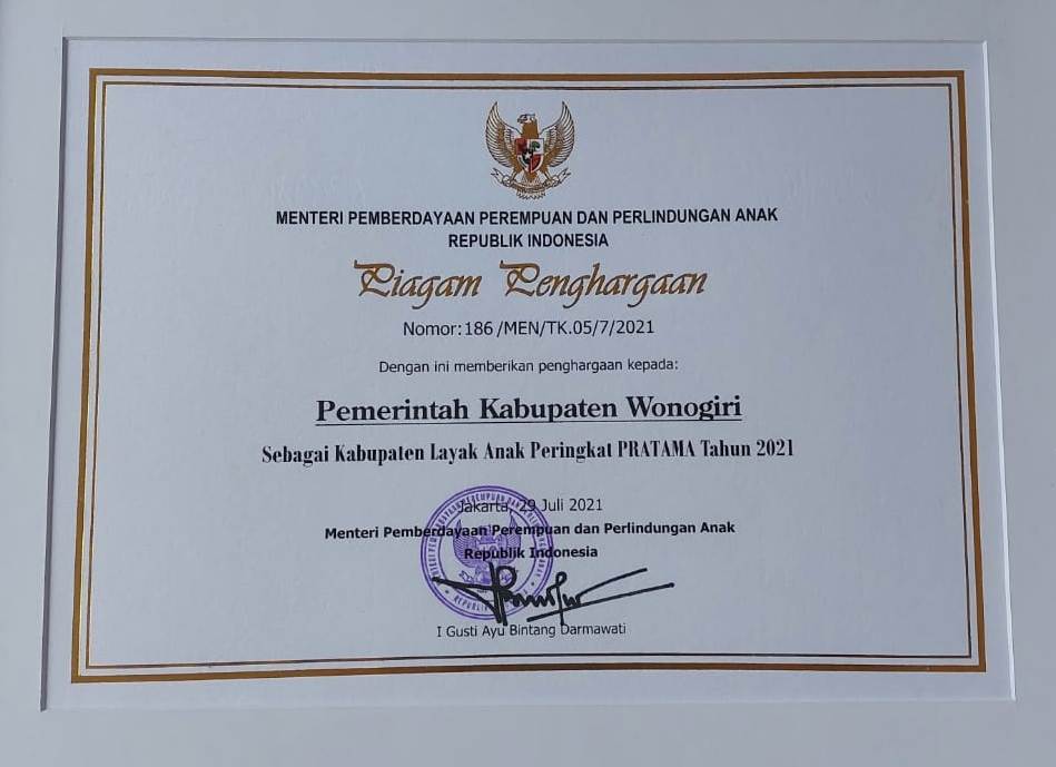 Piagam Penghargaan Kabupaten Layak Anak Predikat Pratama Tahun 2021