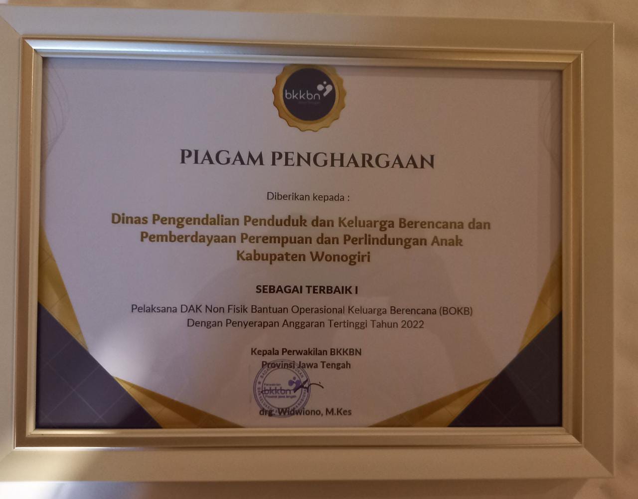 Selamat dan Sukses untuk Keluarga Besar Dinas PPKB dan P3A Kabupaten Wonogiri sebagai Pelaksana Terbaik 1 Provinsi Jateng DAK Non Fisik Bantuan Operasional Keluarga Berencana (BOKB) Tahun 2022.