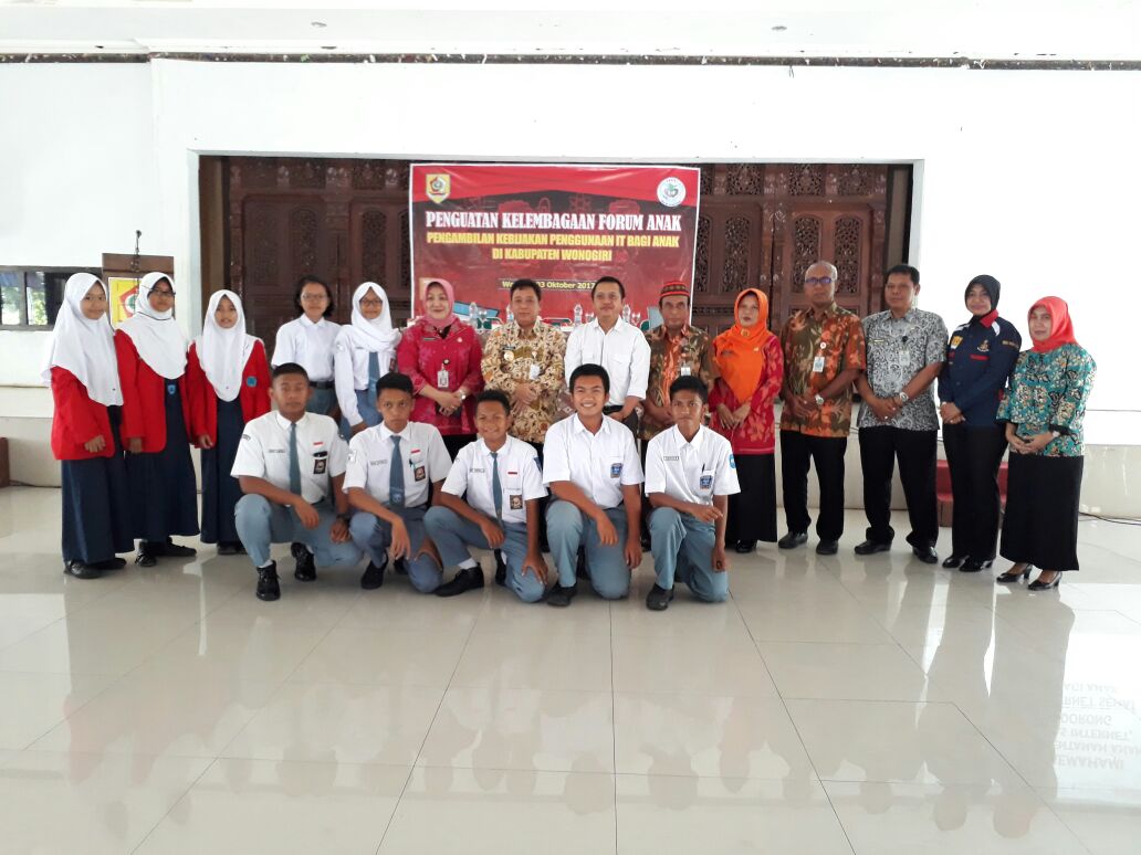 Penguatan Kelembagaan Forum Anak Tahun 2017 mengambil tema Pengambilan Kebijakan Penggunaan IT Bagi Anak di Kabupaten Wonogiri. Forum Anak Wonogiri menggunakan IT secara sehat dan berkwalitas. Sebagian Forum Anak bersama Wakil Bupati Wonogiri Edi Santosa, SH.