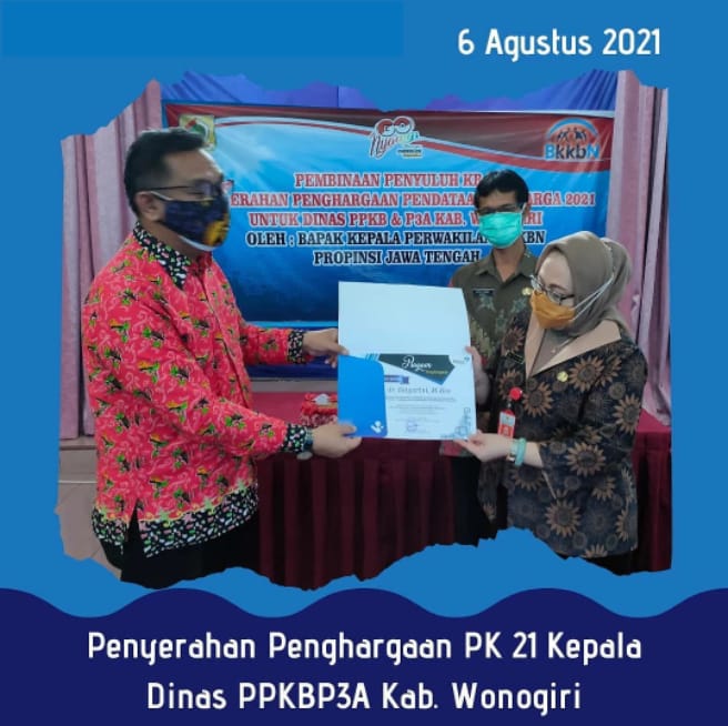 Kunjungan Kepala Perwakilan BKKBN Jateng drg. Widwiono, M.Kes ke Kabupaten Wonogiri dalam rangka Pembinaan kepada Penyuluh KB dan Penyerahan Penghargaan Pelaksanaan Pendataan Keluarga 2021. Penghargaan diberikan kepada Kabupaten Wonogiri yang telah berhasil menyelesaikan Pendataan Keluarga tepat waktu, diterima oleh Asisten Administrasi Umum, Wiyanto, SH, M.Si. Selain itu diberikan juga penghargaan kepada Kepala Dinas PPKB dan P3A Kab. Wonogiri dr. Setyarini, M.Kes yang telah berhasil memimpin kegiatan Pendataan Keluarga 2021 ini sehingga terlaksana dengan baik dan lancar. Pembinaan kepada PKB secara tatap muka diwakili 8 Penyuluh KB, sedangkan para PKB yang lain mengikuti secara dari dari Balai KB masing - masing.