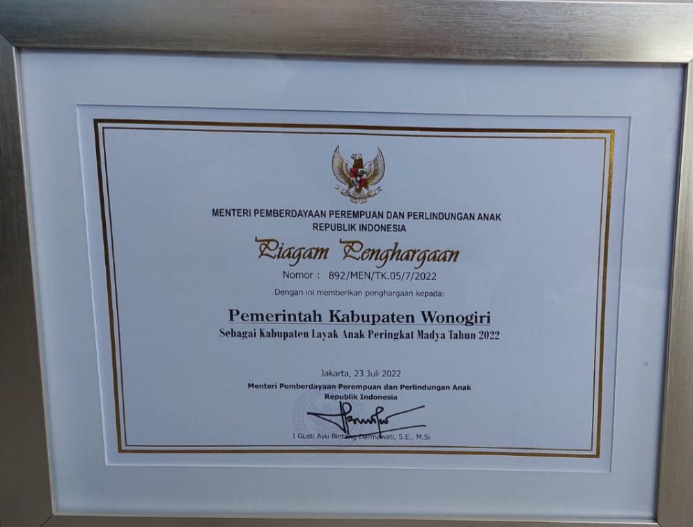PIAGAM PENGHARGAAN KABUPATEN LAYAK ANAK PREDIKAT MADYA TAHUN 2022