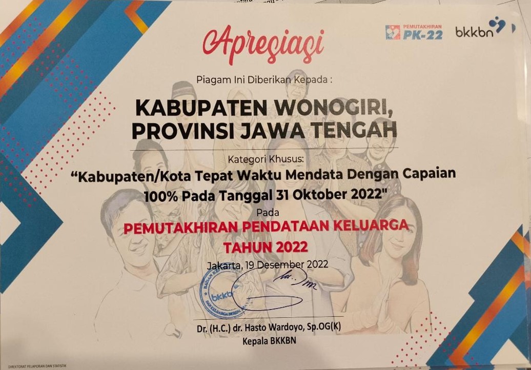 Kabupaten Wonogiri Meraih Piagam Penghargaan dengan Kategori "Kabupaten/Kota Tepat Waktu Mendata Dengan Capaian 100% Pada Tanggal 31 Oktober 2022" pada Pemutakhiran Pendataan Keluarga Tahun 2022.