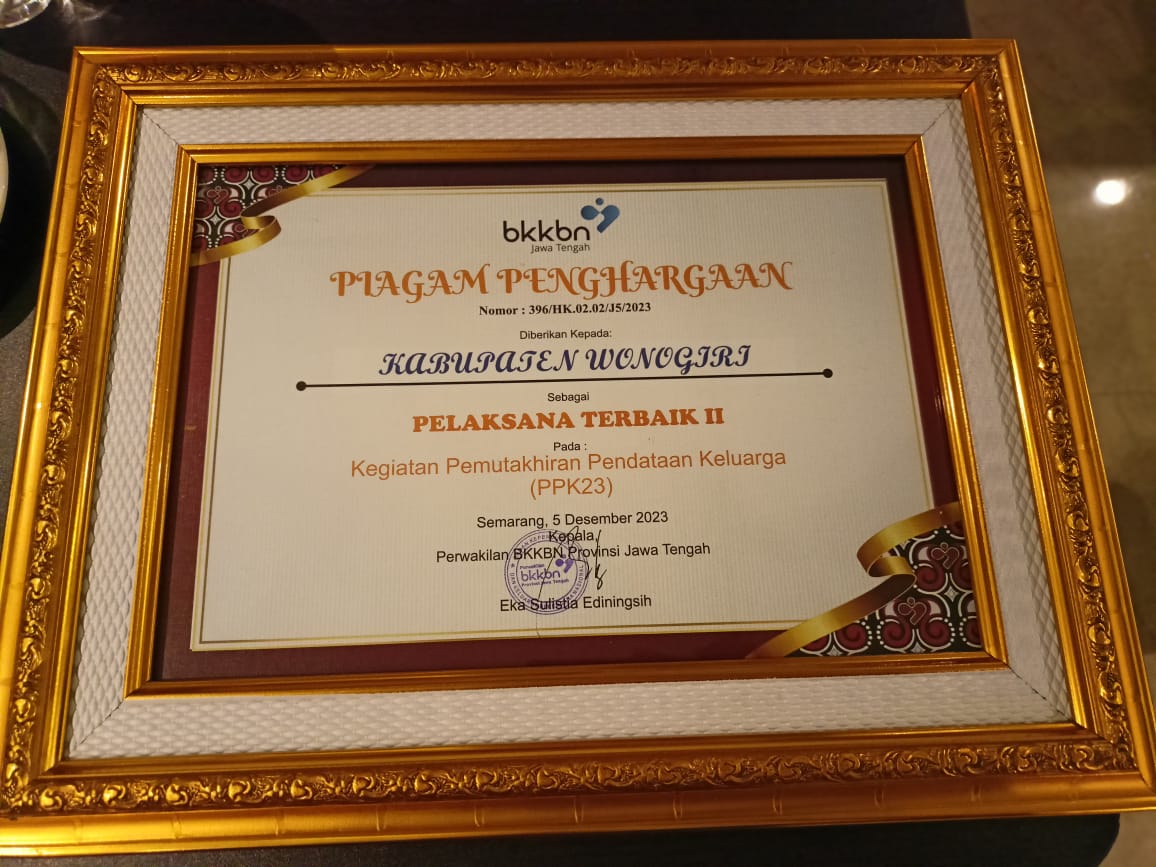 Kabupaten Wonogiri Meraih Piagam Penghargaan dengan Kategori "Kabupaten/Kota Pelaksana Terbaik II Kegiatan Pemutakhiran Pendataaan Keluarga (PPK23) Tahun 2023.