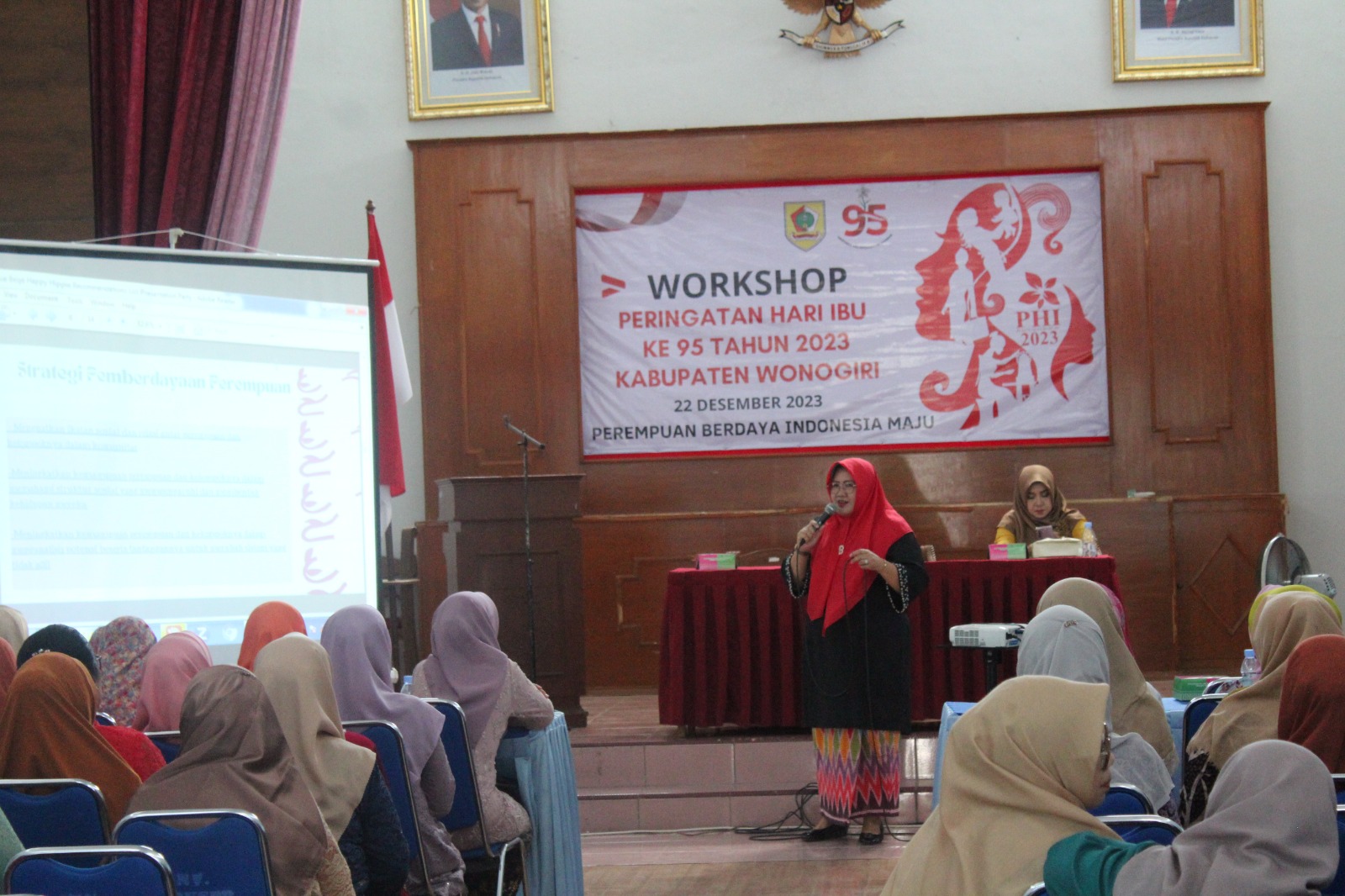 Jumat, 22 Desember 2023. Dinas Pengendalian Penduduk Dan Keluarga Berencana dan Pemberdayaan Perempuan Dan Perlindungan Anak Kabupaten Wonogiri melaksanakan Workshop Peringatan Hari Ibu ke-95 tahun 2023 bertempat di Gedung Pertemuan Griya Kencana Eling Sedulur yang dihadiri oleh Anggota Gabungan Organisasi Wanita (GOW) dan perwakilan pegawai perempuan di seluruh OPD Kabupaten Wonogiri. Kegiatan tersebut mengangkat tema Perempuan Berdaya Indonesia Maju dengan sub tema Perempuan Peduli.