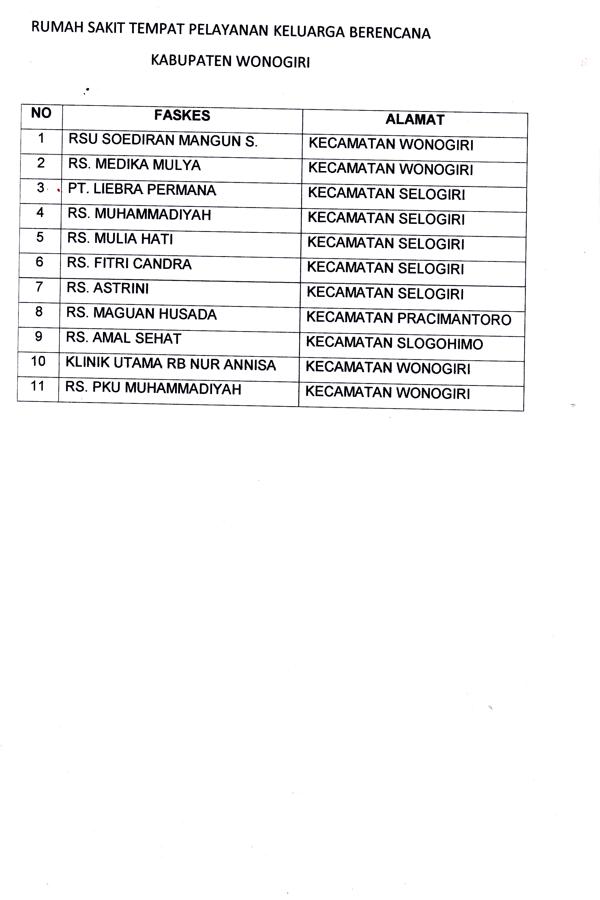 2 Data Rumah Sakit Tempat Pelayanan Keluarga Berencana (KB) Kabupaten Wonogiri Silahkan download